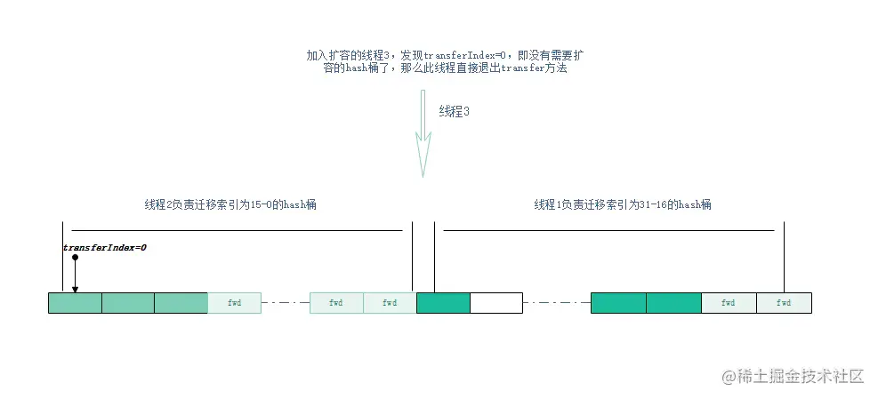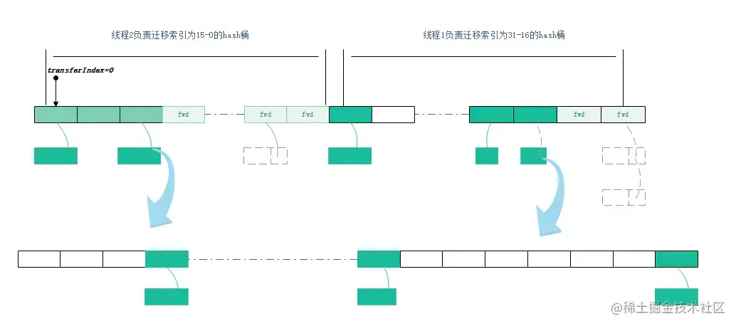 - 每个线程在处理完自己领取的区间后,还可以继续领取,如果还有的话,通过transferIndex变量递减16实现桶数量控制;