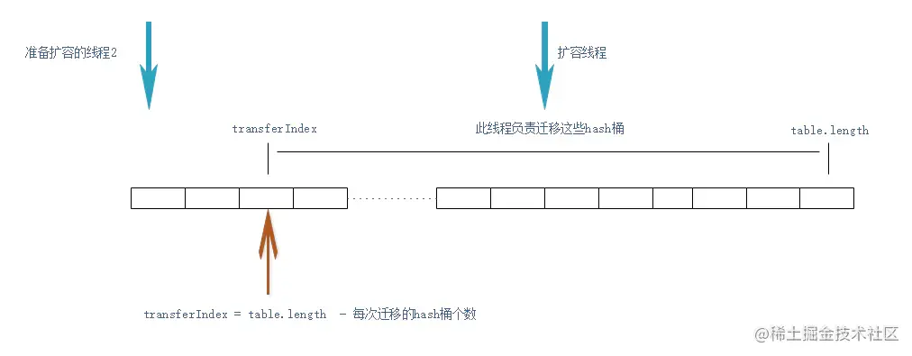 换个角度,我们可以将待迁移的table数组,看成一个任务队列,transferIndex看成任务队列的头指针。而扩容线程,就是这个队列的消费者。扩容线程通过CAS设置transferIndex索引的过程,就是消费者从任务队列中获取任务的过程。