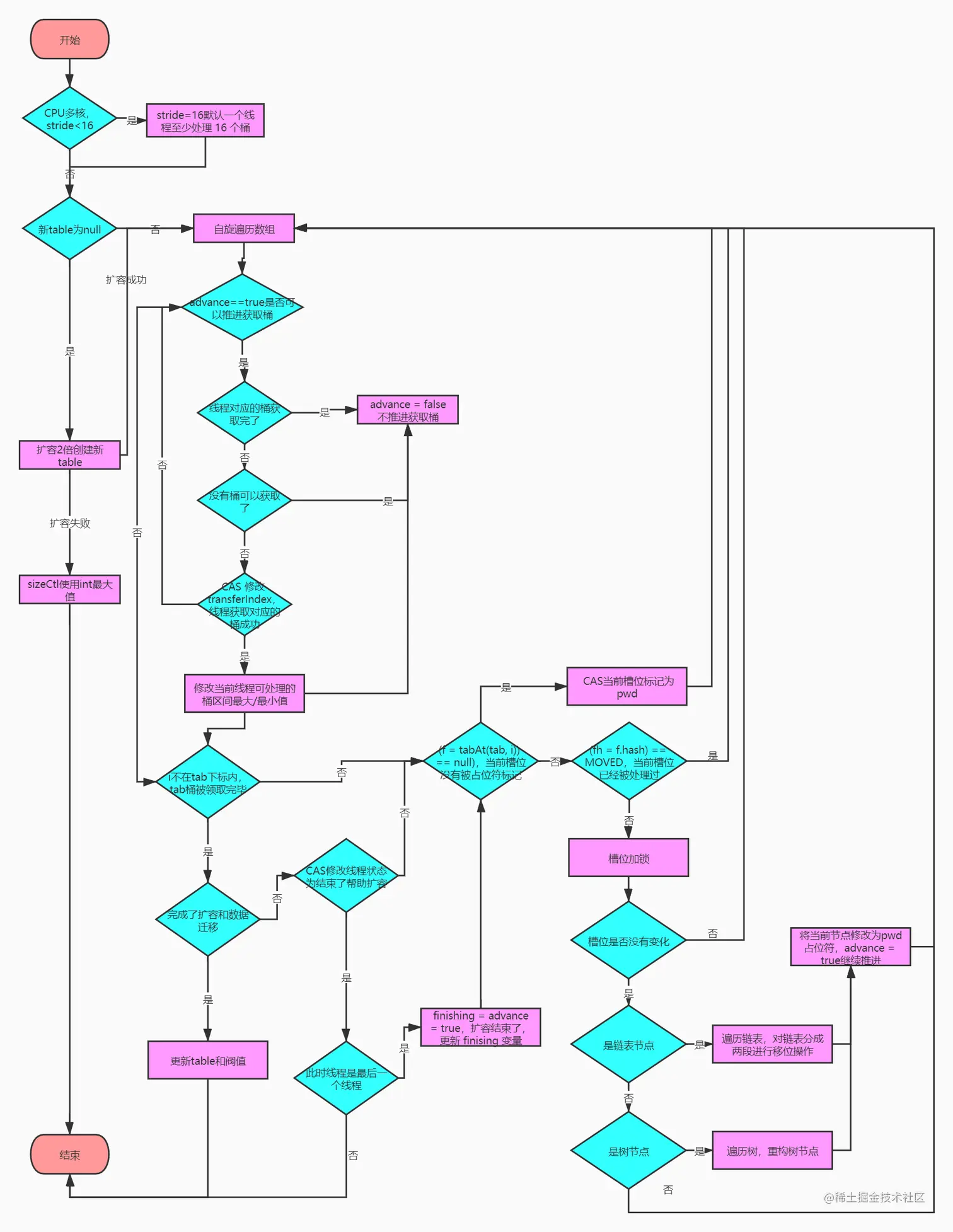 private final void transfer(Node<K,V>[] tab, Node<K,V>[] nextTab) { int n = tab.length, stride; //先判断CPU核数,如果是多核,将数组长度/8,再/核数,得到stride,否则stride=数组长度,如果stride<16,则stride=16 //这里的目的是让每个CPU处理的桶一样多,避免出现转移任务不均匀的现象,如果桶较少的话,默认一个CPU(一个线程)处理16个桶,即确保每次至少获取16个桶(迁移任务) if ((stride = (NCPU > 1) ? (n >>> 3) / NCPU : n) < MIN_TRANSFER_STRIDE) stride = MIN_TRANSFER_STRIDE; // subdivide range //未初始化进行初始化 if (nextTab == null) { // initiating try { @SuppressWarnings("unchecked") Node<K,V>[] nt = (Node<K,V>[])new Node<?,?>[n << 1];//扩容2倍 nextTab = nt;//更新 } catch (Throwable ex) { // try to cope with OOME sizeCtl = Integer.MAX_VALUE;//扩容失败,sizeCtl使用int最大值。 return; } nextTable = nextTab;//更新成员变量 //transferIndex默认=table.length transferIndex = n; } int nextn = nextTab.length;//新tab的长度 //创建一个fwd节点,用于占位。当别的线程发现这个槽位中是fwd类型的节点,表示其他线程正在扩容,并且此节点已经扩容完毕,跳过这个节点。关联了nextTab,可以通过ForwardingNode.find()访问已经迁移到nextTab的数据。 ForwardingNode<K,V> fwd = new ForwardingNode<K,V>(nextTab); //首次推进为 true,如果等于true,说明需要再次推进一个下标(i--),反之,如果是false,那么就不能推进下标,需要将当前的下标处理完毕才能继续推进 boolean advance = true; //完成状态,如果是true,就结束此方法。 boolean finishing = false; // to ensure sweep before committing nextTab //自旋,i表示当前线程可以处理的当前桶区间最大下标,bound表示当前线程可以处理的当前桶区间最小下标 for (int i = 0, bound = 0;;) { Node<K,V> f; int fh; //while:如果当前线程可以向后推进;这个循环就是控制i递减。同时,每个线程都会进入这里取得自己需要转移的桶的区间 //分析场景:table.length=32,此时执行到这个地方nextTab.length=64 A,B线程同时进行扩容。 //A,B线程同时执行到while循环中cas这段代码 //A线程获第一时间抢到资源,设置bound=nextBound=16,i = nextIndex - 1=31 A线程搬运table[31]~table[16]中间16个元素 //B线程再次回到while起点,然后在次获取到 bound = nextBound-0,i=nextIndex - 1=15,B线程搬运table[15]~table[0]中间16个元素 //当transferIndex=0的时候,说明table里面所有搬运任务都已经完成,无法在分配任务。 while (advance) { int nextIndex, nextBound; // 对i减1,判断是否大于等于bound(正常情况下,如果大于bound不成立,说明该线程上次领取的任务已经完成了。那么,需要在下面继续领取任务) // 如果对i减1大于等于 bound,或者完成了,修改推进状态为 false,不能推进了。任务成功后修改推进状态为 true。 // 通常,第一次进入循环,i-- 这个判断会无法通过,从而走下面的nextIndex = transferIndex(获取最新的转移下标)。其余情况都是:如果可以推进,将i减1,然后修改成不可推进。如果i对应的桶处理成功了,改成可以推进。 if (--i >= bound || finishing) advance = false;//这里设置false,是为了防止在没有成功处理一个桶的情况下却进行了推进 // 这里的目的是:1. 当一个线程进入时,会选取最新的转移下标。 // 2. 当一个线程处理完自己的区间时,如果还有剩余区间的没有别的线程处理,再次CAS获取区间。 else if ((nextIndex = transferIndex) <= 0) { // 如果小于等于0,说明没有区间可以获取了,i改成-1,推进状态变成false,不再推进 // 这个-1会在下面的if块里判断,从而进入完成状态判断 i = -1; advance = false;//这里设置false,是为了防止在没有成功处理一个桶的情况下却进行了推进 } // CAS修改transferIndex,即 length - 区间值,留下剩余的区间值供后面的线程使用 else if (U.compareAndSwapInt (this, TRANSFERINDEX, nextIndex, nextBound = (nextIndex > stride ? nextIndex - stride : 0))) { bound = nextBound;//这个值就是当前线程可以处理的最小当前区间最小下标 i = nextIndex - 1;//初次对i赋值,这个就是当前线程可以处理的当前区间的最大下标 advance = false;// 这里设置false,是为了防止在没有成功处理一个桶的情况下却进行了推进,这样导致漏掉某个桶。下面的 if(tabAt(tab, i) == f) 判断会出现这样的情况。 } } //i<0(不在 tab 下标内,按照上面的判断,领取最后一段区间的线程结束) if (i < 0 || i >= n || i + n >= nextn) { int sc; if (finishing) {// 如果完成了扩容和数据迁移 nextTable = null;//删除成员遍历 table = nextTab;//更新table sizeCtl = (n << 1) - (n >>> 1);//更新阀值 return;//结束transfer } //如果没完成,尝试将sc -1. 表示这个线程结束帮助扩容了,将 sc 的低 16 位减一。 if (U.compareAndSwapInt(this, SIZECTL, sc = sizeCtl, sc - 1)) { //如果 sc - 2 不等于标识符左移 16 位。如果他们相等了,说明没有线程在帮助他们扩容了。也就是说,扩容结束了。 /** *第一个扩容的线程,执行transfer方法之前(helpTransfer方法中),会设置 sizeCtl = (resizeStamp(n) << RESIZE_STAMP_SHIFT) + 2) *后续帮其扩容的线程,执行transfer方法之前,会设置 sizeCtl = sizeCtl+1 *每一个退出transfer的方法的线程,退出之前,会设置 sizeCtl = sizeCtl-1 *那么最后一个线程退出时: *必然有sc == (resizeStamp(n) << RESIZE_STAMP_SHIFT) + 2),即 (sc - 2) == resizeStamp(n) << RESIZE_STAMP_SHIFT */ if ((sc - 2) != resizeStamp(n) << RESIZE_STAMP_SHIFT) return;// 不相等,说明不到最后一个线程,直接退出transfer方法 finishing = advance = true;// 如果相等,扩容结束了,更新 finising 变量 i = n; // recheck before commit,最后退出的线程要重新check下是否全部迁移完毕 } } else if ((