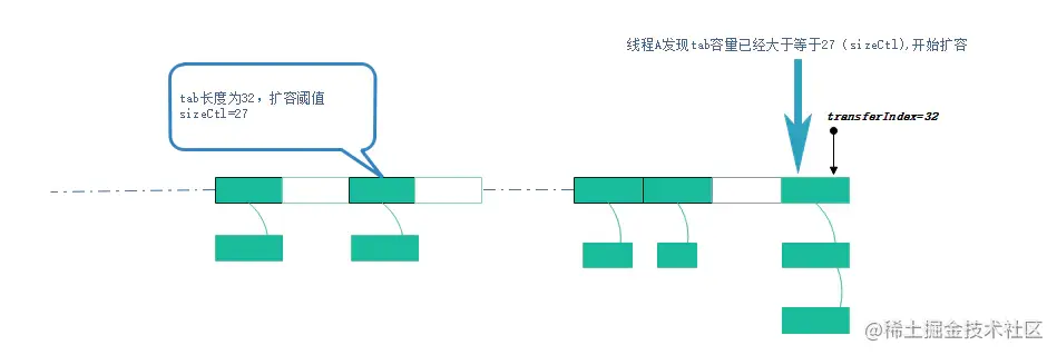 容量已经达到扩容阈值,需要进行扩容操作,此时transferindex=tab.length=32