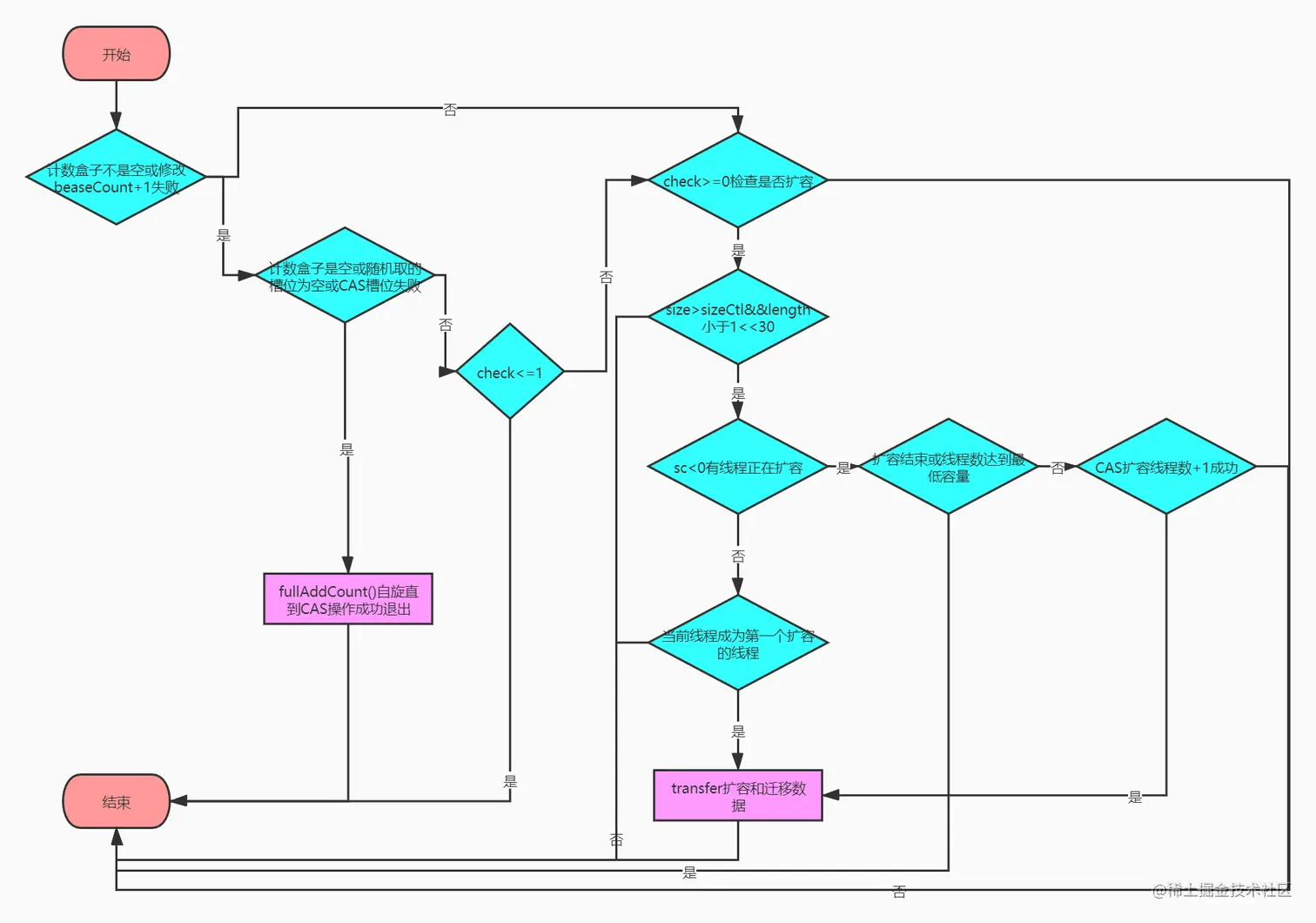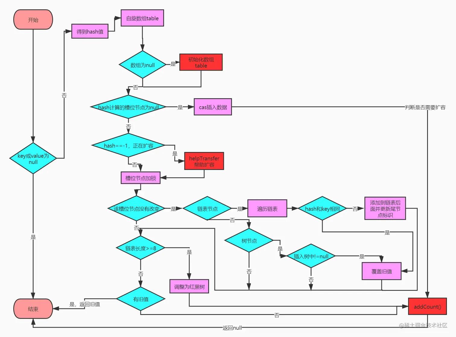 - 调用addCount(),对size+1,并判断是否需要扩容addCount(),如果是值覆盖操作就不需要调用该方法;