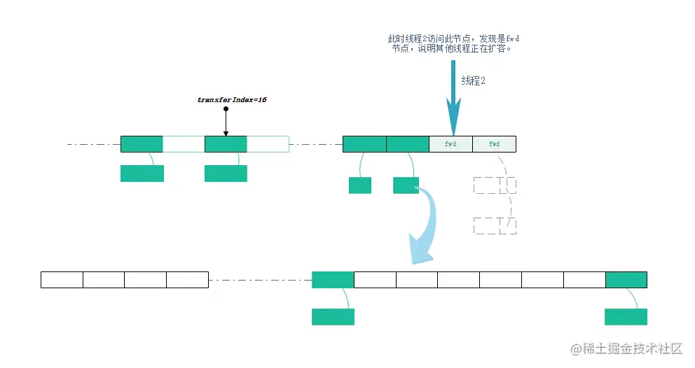 - 每次处理空桶的时候,会把当前桶标识为forward节点,告诉put的其他线程说“我正在扩容,快来帮忙”,但如果只有16个桶,只能有一个线程进行扩容;