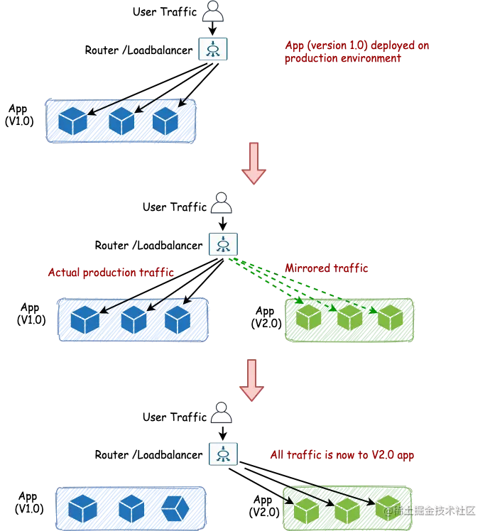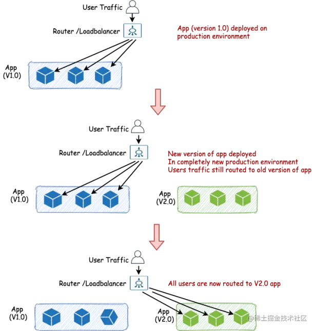 - 当应用团队对新环境的稳定性有信心时,负载平衡器/路由器就会把所有的用户流量导向新的应用。