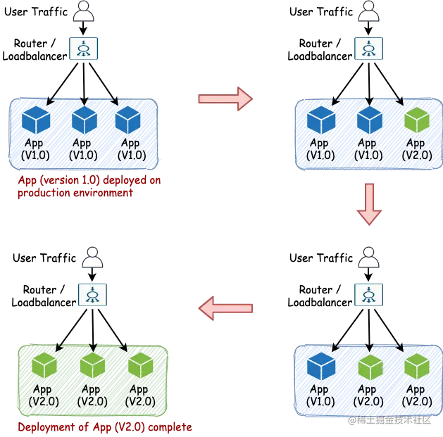 - 这是一种分阶段的部署方式,新版本的应用程序以滚动的方式一次一次地部署在生产服务器上。