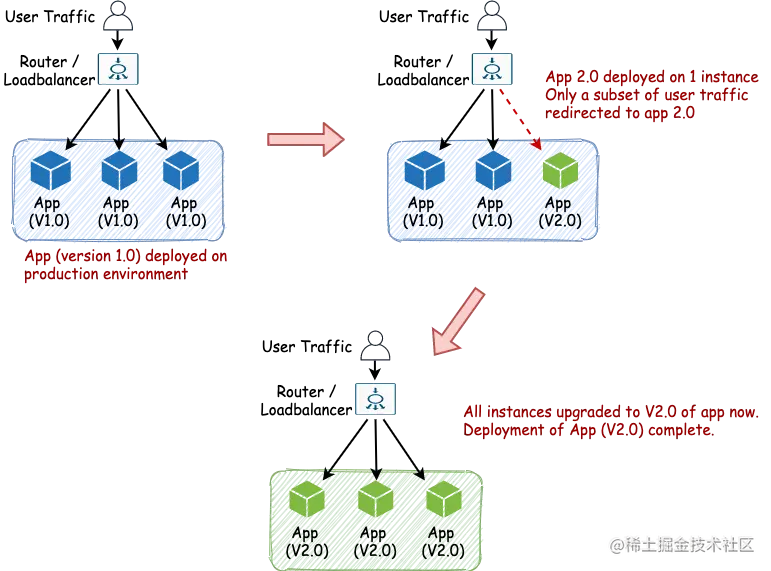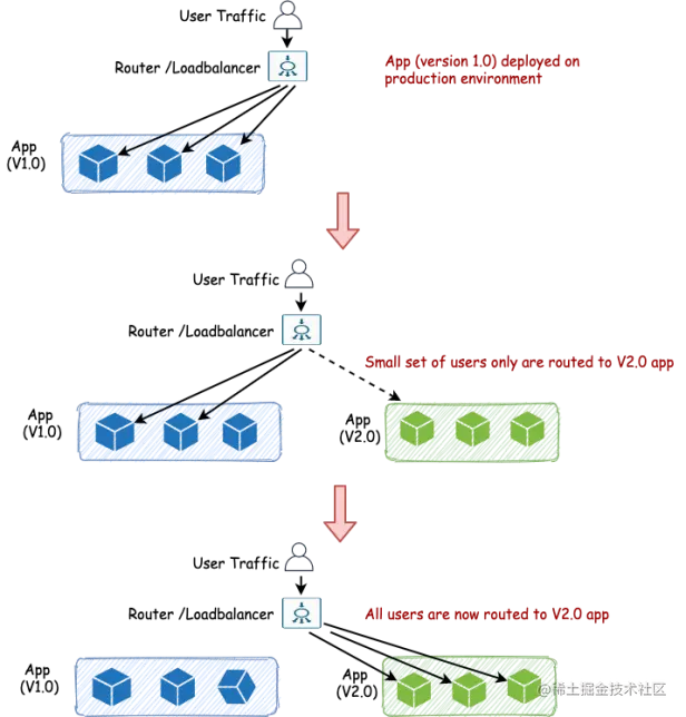 - 它几乎类似于蓝绿色部署--唯一的区别是只有一小部分用户首先被切换到新的应用程序。