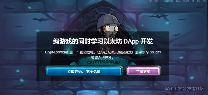 僵尸工厂是一个关于solidity编写智能合约的一个小游戏,里面涉及到了solidity的大部分基础内容,玩者跟着他的引导写代码,一步一步把僵尸游戏写出来。