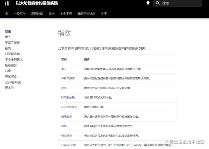 与前一个网站类似,同样包含了以太坊中的solidity漏洞分析,不同的是这个网站统计的是以太坊历史上遭受的重大攻击并进行分析,以预防以后再次遭受到同样的攻击而无法解决。