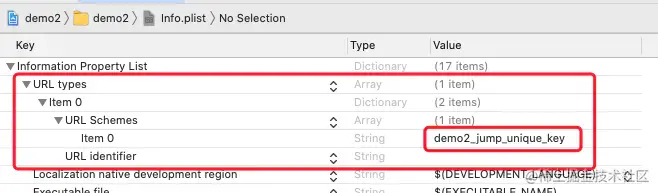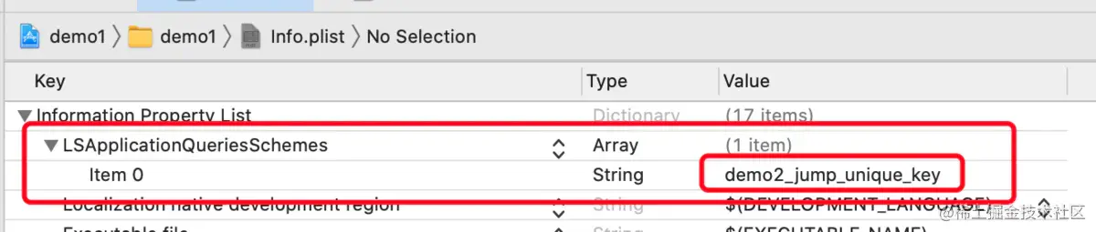 在项目 demo1的 Info.plist 中添加字段 LSApplicationQueriesSchemes, 类型设置为 Array,添加项目 demo2 中配置的URL demo2JumpUniqueKey。