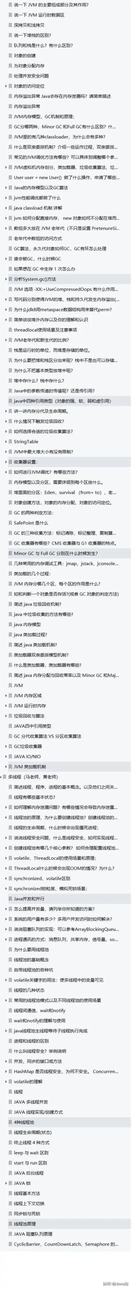 从java基础语法、JVM、多线程到MySQL、spring、springboot、springcloud,再有dubbo、mybatis、redis、网络底层IO、Linux、MQ、zookeeper、netty、大数据、数据结构与算法、再到设计模式等等,可谓是非常之全!