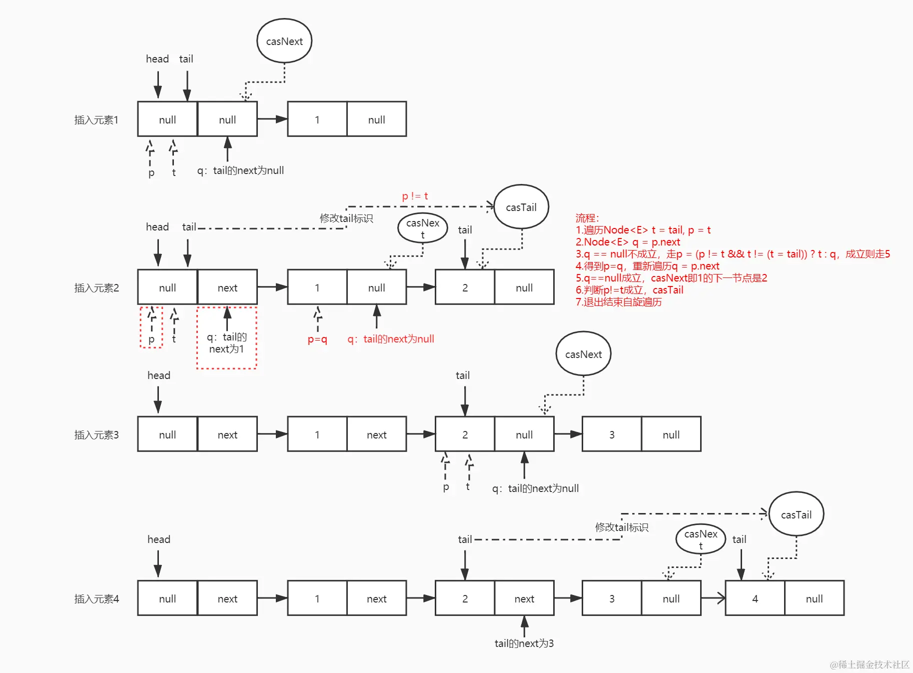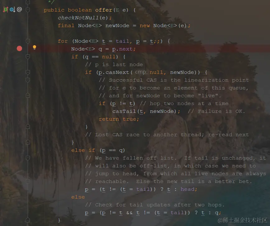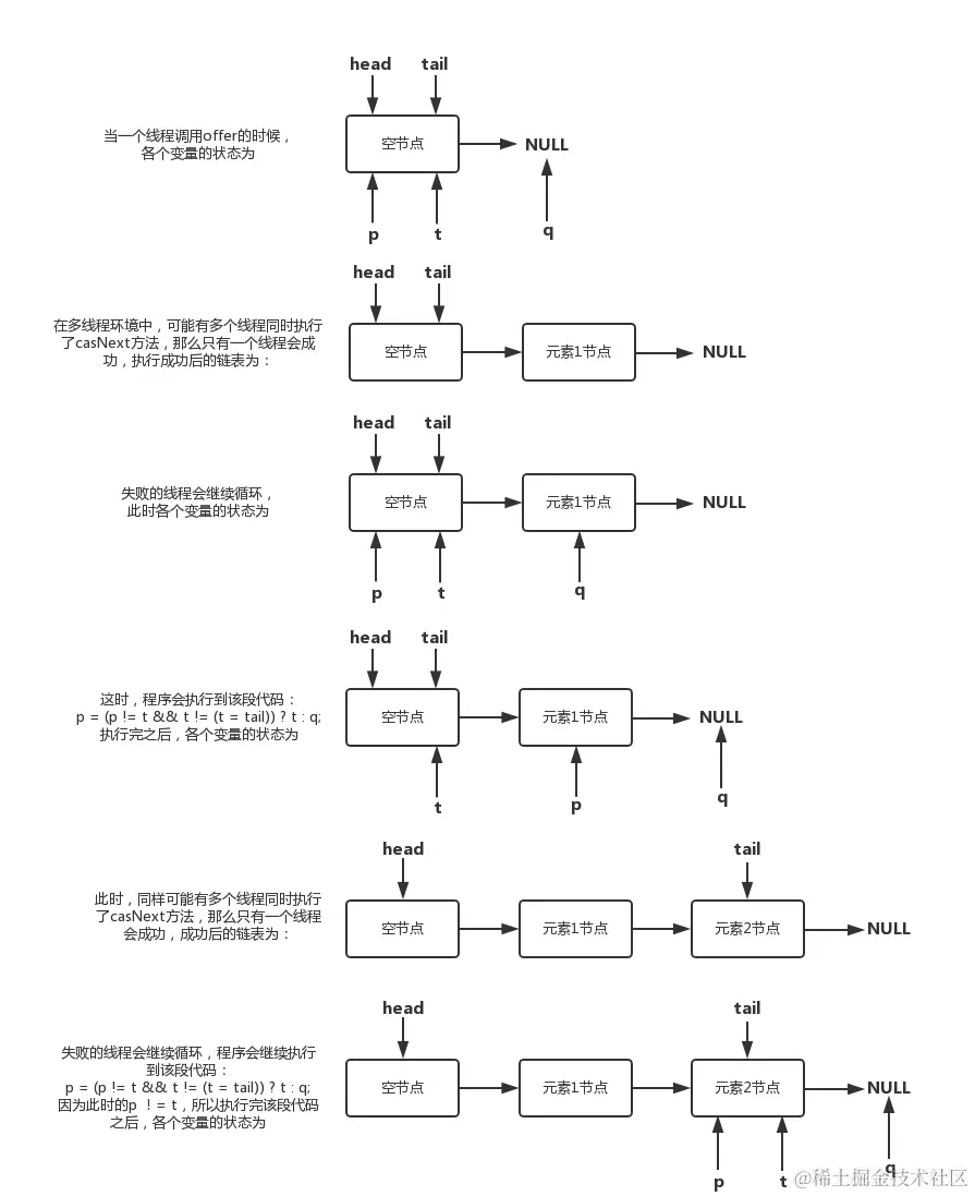 public boolean add(E e) { return offer(e); } public boolean offer(E e) { checkNotNull(e);//检查是否为空 //创建入队节点,将元素添加到节点中 final Node<E> newNode = new Node<E>(e); //自旋队列CAS直到入队成功 // 1、根据tail节点定位出尾节点(last node);2、将新节点置为尾节点的下一个节点;3、casTail更新尾节点 for (Node<E> t = tail, p = t;;) { //p是尾节点,q得到尾节点的next Node<E> q = p.next; //如果q为空 if (q == null) { //p是last node,将尾节点的next修改为创建的节点 if (p.casNext(null, newNode)) { //p在遍历后会变化,因此需要判断,如果不相等即p != t = tail,表示t(= tail)不是尾节点,则将入队节点设置成tail节点,更新失败了也没关系,因为失败了表示有其他线程成功更新了tail节点 if (p != t) casTail(t, newNode);//入队节点更新为尾节点,允许失败,因此t= tail并不总是尾节点 return true;//结束 } } //重新获取head节点:多线程操作时,轮询后p有可能等于q,此时,就需要对p重新赋值 //(多线程自引用的情况,只有offer()和poll()交替执行时会出现) else if (p == q) //因为并发下可能tail被改了,如果被改了,则使用新的t,否则跳转到head,从链表头重新轮询,因为从head开始所有的节点都可达 p = (t != (t = tail)) ? t : head;//运行到这里再继续自旋遍历 else /** * 寻找尾节点,同样,当t不等于p时,说明p在上面被重新赋值了,并且tail也被别的线程改了,则使用新的tail,否则循环检查p的下个节点 * (多offer()情况下会出现) * p=condition?result1:result2 * 满足result1的场景为 : * 获取尾节点tail的快照已经过时了(其他线程更新了新的尾节点tail),直接跳转到当前获得的最新尾节点的地方 * 满足result2的场景为: * 多线程同时操作offer(),执行p.casNext(null, newNode)CAS成功后,未更新尾节点(未执行casTail(t, newNode)方法:两种原因 1是未满足前置条件if判断 2是CAS更新失败),直接找next节点 */ p = (p != t && t != (t = tail)) ? t : q;//运行到这里再继续自旋遍历 } }