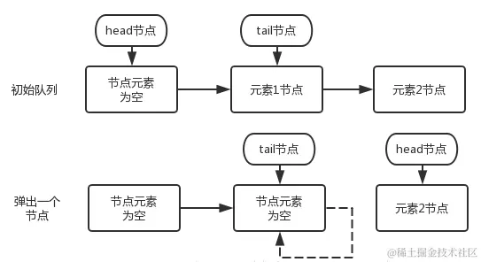 - 在弹出一个节点之后,tail节点有一条指向自己的虚线,这是什么意思呢?在poll()方法中,移除元素之后,会调用updateHead方法,其中有h.lazySetNext(h),可以看到,在更新完head之后,会将旧的头结点h的next域指向为h,上图中所示的虚线也就表示这个节点的自引用。
