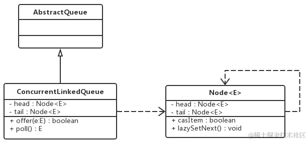 从类图中可以看到,ConcurrentLinkedQueue由head和tail节点组成,每个节点Node由节点元素item和指向下一个节点的引用next组成,节点与节点之间通过next关联起来组成一张链表结构的队列。