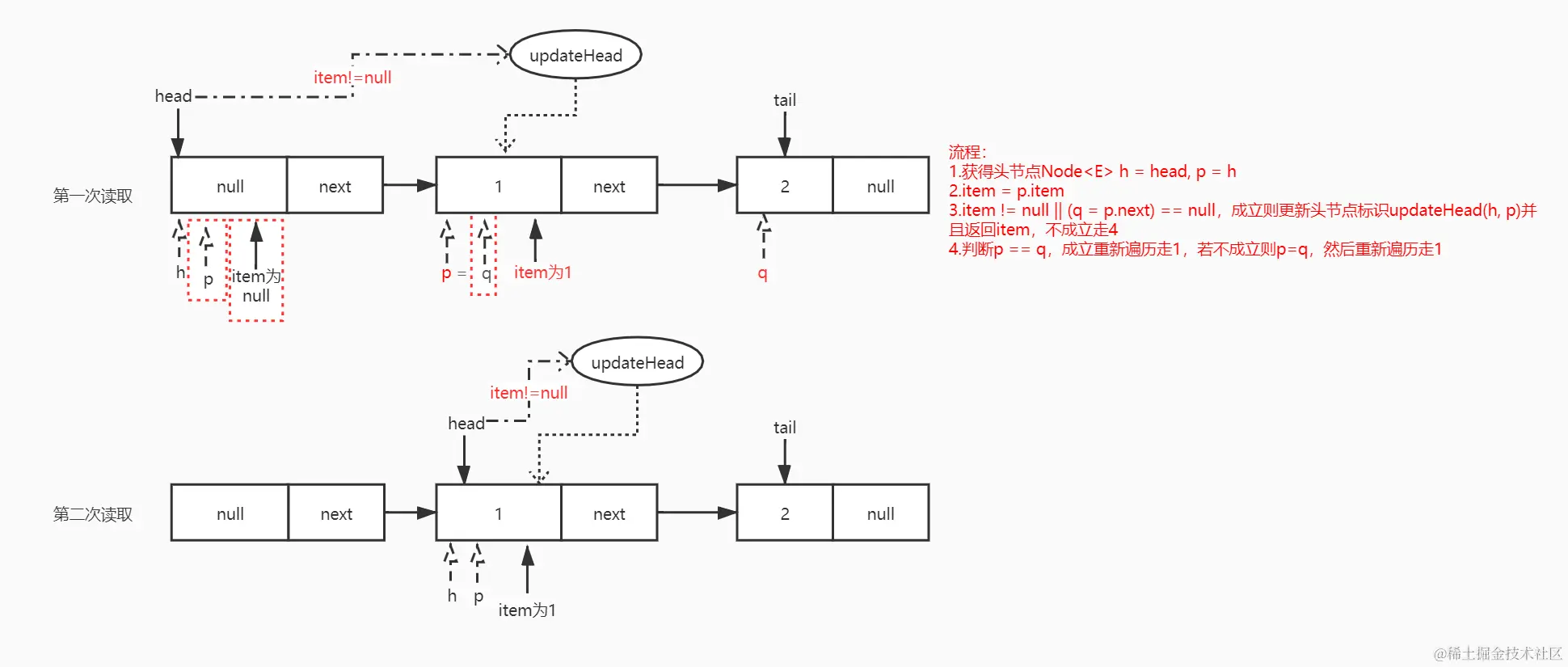 public E poll() { restartFromHead: //自旋 for (;;) { //获得头节点 for (Node<E> h = head, p = h, q;;) { E item = p.item;//获得头节点元素 //如果头节点元素不为null并且cas删除头节点元素成功 if (item != null && p.casItem(item, null)) { //p被修改了 if (p != h) // hop two nodes at a time // 如果p 的next 属性不是null ,将 p 作为头节点,而 q 将会消失 updateHead(h, ((q = p.next) != null) ? q : p); return item; } //如果头节点的元素为空或头节点发生了变化,这说明头节点已经被另外一个线程修改了。 // 那么获取p节点的下一个节点,如果p节点的下一节点为null,则表明队列已经空了 // 如果 p(head) 的 next 节点 q 也是null,则表示没有数据了,返回null,则将 head 设置为null // 注意:updateHead 方法最后还会将原有的 head 作为自己 next 节点,方便offer 连接。 else if ((q = p.next) == null) { updateHead(h, p); return null; } //如果 p == q,说明别的线程取出了 head,并将 head 更新了。就需要重新开始获取head节点 else if (p == q) continue restartFromHead; // 如果下一个元素不为空,则将头节点的下一个节点设置成头节点 else p = q; } } } final void updateHead(Node<E> h, Node<E> p) { if (h != p && casHead(h, p)) // 将旧的头结点h的next域指向为h h.lazySetNext(h); }