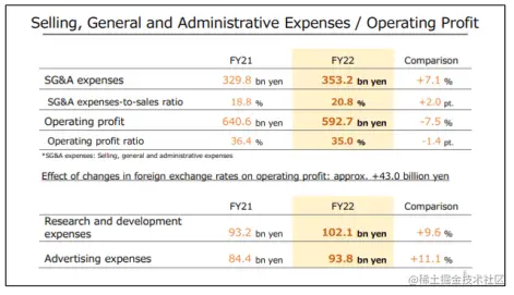 另一个需要主要的点是外汇效应。由于日本和西方在紧缩政策上的分歧,日元正在迅速走弱。 截至财年报告时,外汇效应已经影响了损益表,导致 SG&A 上升,而美国业务的一部分已发生成本以美元计价,对呈报货币产生负面影响。