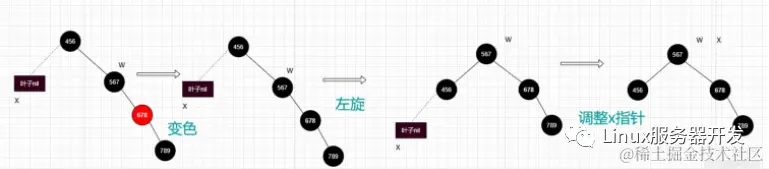 // 情况4:x的兄弟结点是黑色的,兄弟的左孩子是红色,右孩子是黑色