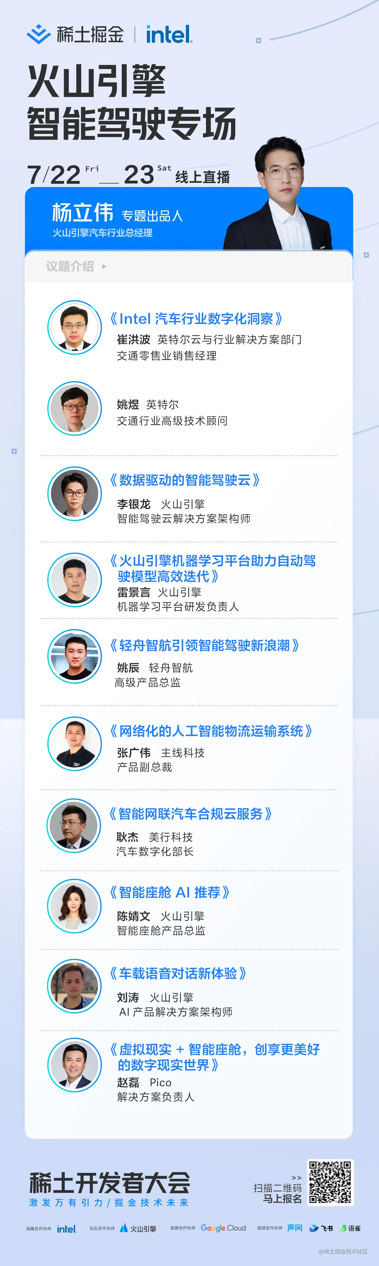 7 月 22、23 日,在由稀土掘金技术社区主办的第二届稀土开发者大会上,火山引擎汽车行业总经理杨立伟将作为 《火山引擎智能驾驶专场》 出品人,引领参会者一起聚焦智能驾驶时代下的科技前沿洞察和技术分享,汇聚火山引擎智能驾驶行业伙伴强大阵容,技术大咖与最佳实践案例结合,释放真正让云端引擎和数据智能成为智能汽车进步的源动力。