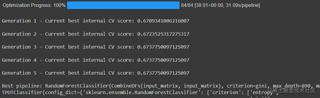 参数定义后,然后通过定义所需的代数、种群大小、子代大小和需要优化的超参数模型,来建立pot分类器。本文使用评分技术作为准确性。