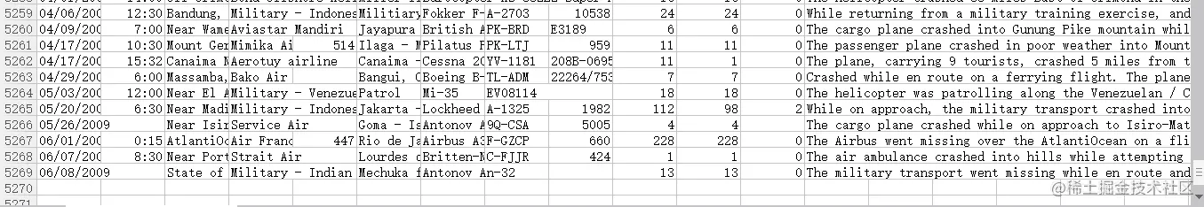 首先分析这个文档,,关于美国历来每次飞机失事的数据,包含时间地点、驾驶员、死亡人数、总人数、事件描述,一共有12列,第一列是标题,下面一共有5268条数据。