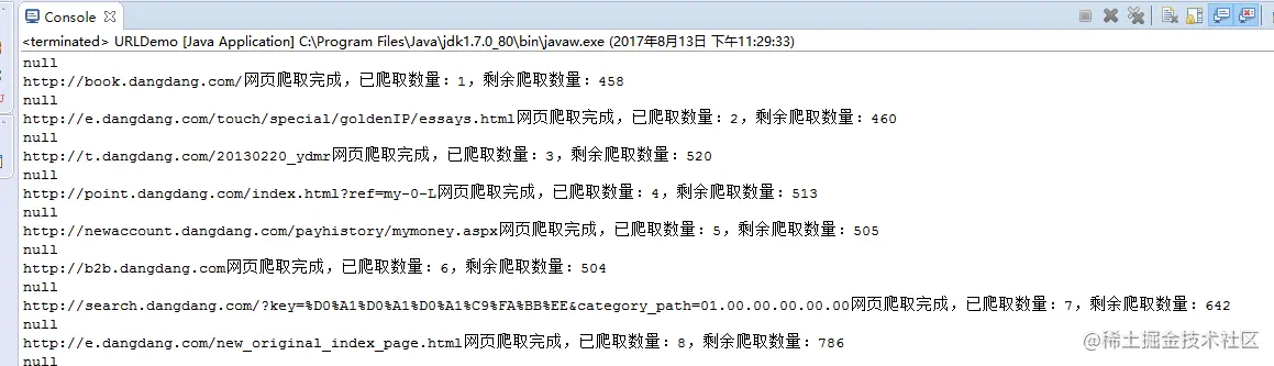 126 System.out.println(strurl+"网页爬取完成,已爬取数量:"+alloverurl.size()+",剩余爬取数量:"+allwaiturl.size());