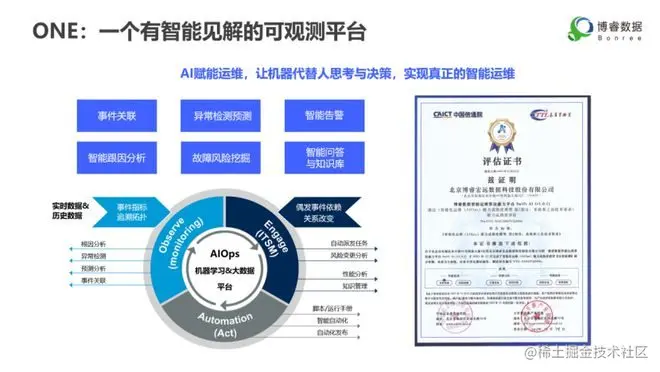 2022年5月,博睿数据正式发布了一体化智能可观测平台ONE,凭借着智能的见解和卓越的体验,ONE平台成功入选了中国信通院发布的2022年度“云原生产品名录”中的中间件服务和其他服务两类产品名录。作为一个“有见解的”一体化智能可观测平台,ONE平台从ITOM 统一监控、AIOps智能运维、BizOps业务运营、DevOps效能提升四个应用场景出发,凭借自身强大的大数据及AI能力,帮助客户走出数据中心, 打通云管边端, 实现传统的产品工具到平台+架构的转型。