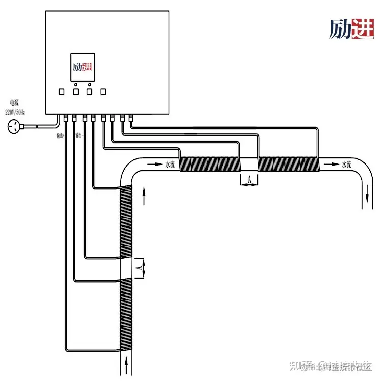 6、缠绕方式应符合磁场右手定律,即用右手握进水管道,以水流方向为右手大拇指指向,其他手指的指向就是电缆线开始缠绕的走向,电缆缠绕的伸展方向与水流方向一致(不能绕反,否则效果大受影响)。