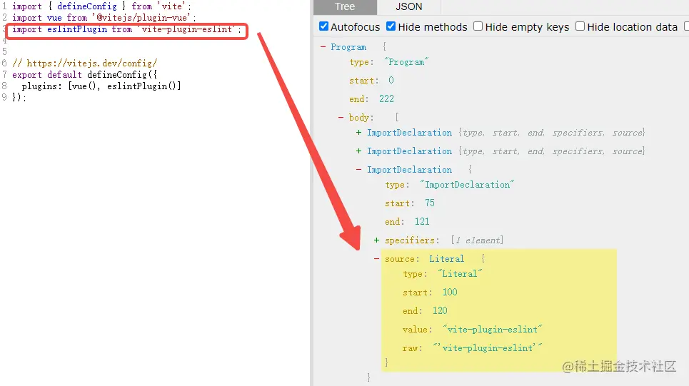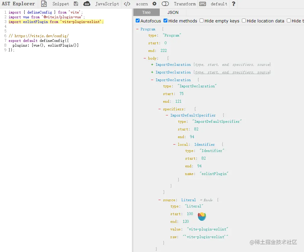 babel.parseSync 解析代码返回AST , AST即抽象语法树是编译原理中的一个概念。您可以使用astexplorer.net/将代码解析为抽象语法树。如下图所示是笔者将被处理后的vite.config.js解析为抽象语法树。