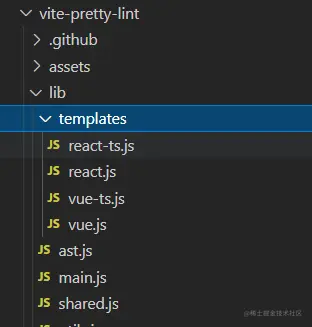 上述代码读取templates目录下的文件,获取文件名放入OPTIONS中,最后的OPTIONS就包含了所有的项目类型。包括react-ts, react, vue-ts和vue, 如下图所示: