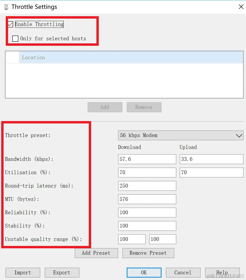 - Throttle Preset:选择网络类型,比如选择 56 kbps modem