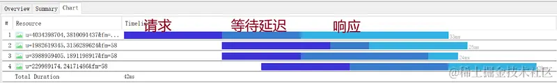 Chart 记录了资源的生命周期,从请求到等待到响应请求。它还将相关资源分组,比如下面的 4 个 Resource 是一组: