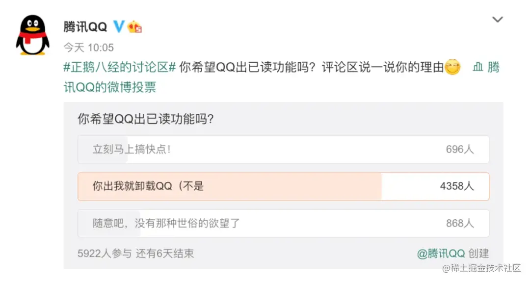 比如,微信、QQ这种既具备“私人性”的同时又具备“较强关系”的社交软件,那么它的设计是没有“已读”功能。微信开发者张小龙在接受采访时表示,微信不具备“已读”功能是出于“更加贴近人性”的设计,毕竟人人都会有不得不“撒谎”的时候。而张小龙所说的,也恰好符合用户的心理,在2020年底QQ平台曾展开“你希望QQ做已读功能”的投票,得到的结果是大部分人抗拒上线这个功能,或许这就是微信和QQ这种作为拥有庞大用户体量的社交类即时通讯,至今仍未上线“已读”功能的原因所在。