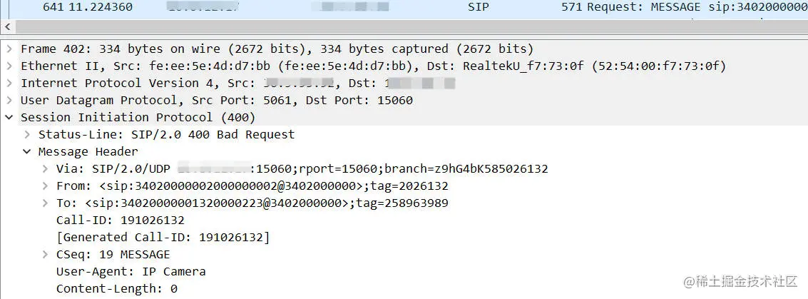 1)首先进行抓包,发现设备端回复400错误,这表明设备注册上来后,平台对其做出了应答。