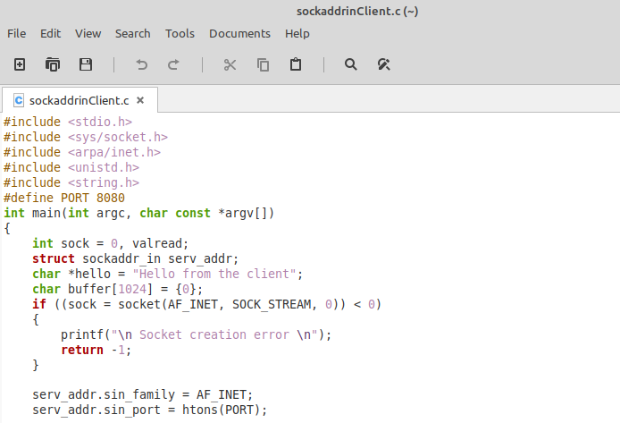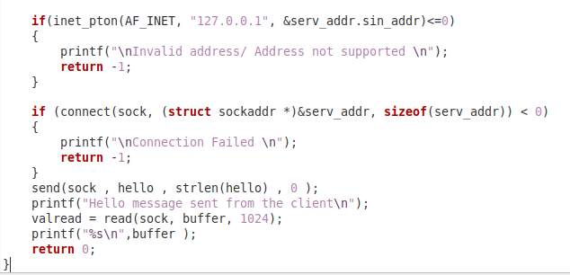 我们首先包含了所有需要的库和头文件,然后是我们的 "main() "函数,其中我们创建了两个整数变量,名为 "sock "和 "valread"。然后,我们创建了一个名为 "sockaddr_in "结构的对象 "serv_addr"。之后,我们创建了一个 "hello "字符指针,并将我们想发送给服务器的信息分配给它。然后,我们有一个字符类型的缓冲区来保存服务器收到的消息。我们也有一个 "if "语句来检查是否有一个套接字创建错误。