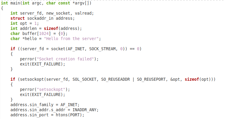 在包含了这些库之后,我们有了 "main() "函数,其中我们声明了三个整数变量,名为 "server_fd"、new_socket和 "valread"。我们将在以后的代码中利用这三个变量。然后,我们创建了一个名为 "address "的 "sockaddr_in "结构的对象。然后,我们创建了另一个整数变量 "opt",并为其赋值 "1"。之后,我们创建了一个名为 "addrlen "的整数变量,并为其分配了 "address "对象的大小。我们创建了一个字符类型的缓冲区,用于保存客户端发送的信息。然后,我们创建了一个名为 "hello "的字符型指针,并为其分配了一个样本信息。