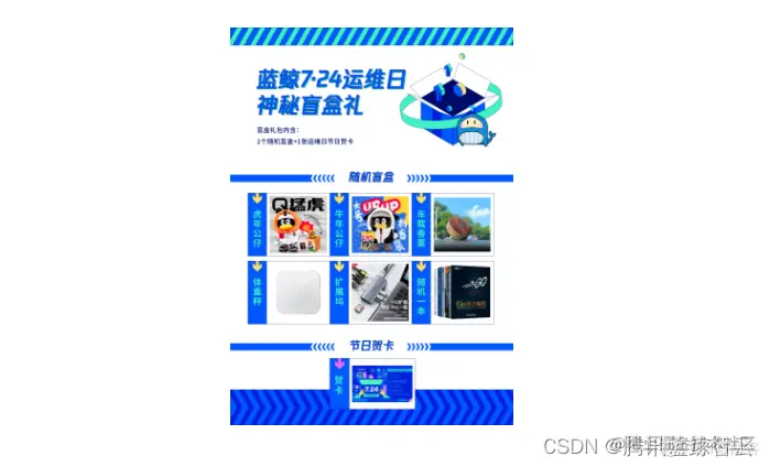 以上四类心愿各评选出5个,共20个小伙伴,送出腾讯蓝鲸7·24运维日神秘盲盒礼包