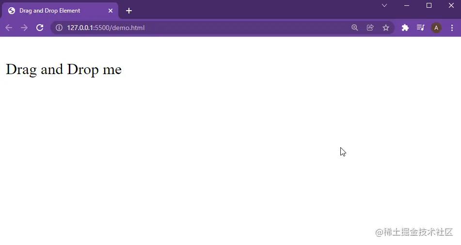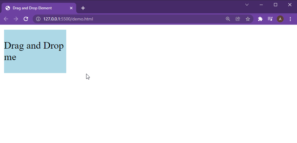 .dragElement { width: 100px; height: 70; background-color:lightblue; display: inline-block; align-items: center; vertical-align: bottom; } /style> 通过改变这个样式,你可以在网页上得到以下输出。  对于脚本代码,创建一个新的**脚本标签<script>,** 我们将把javascript放在这个脚本标签里面。对于javascript部分,我们将首先创建一个新的**var** ,以后将使用元素的引用来改变它在网页上的位置。 var dragValue。 接下来,我们将创建一个名为**move()**的函数,用来移动该元素。在这个移动函数中,我们要做的第一件事是用下面这行代码在一个变量中获得我们元素的引用。 var element\=document.getElementById("dragElement")。 既然我们有了引用,我们就要把这个元素的位置设置为绝对值。因为我们要用我们的选择来移动这个元素,我们要把它准确地放在我们想要的位置,而不是相对于其他元素。 element.style.position \= "absolute"; 当我们点击这个元素时,我们想把我们的元素的引用传递给**"dragValue "**变量,这样我们就可以操纵它的位置。 element.onmousedown \=function( ){ dragValue\=element; }。 现在,我们已经将我们的元素的引用存储在**dragValue** 变量中,我们现在要通过使用以下几行代码将其置于鼠标的位置。 document.onmousemove \=function(e ){ var x\=e.pageX; var y\=e.pageY; dragValue.style.left \=x+ "px"; dragValue.style.top \=y+ "px"; }; 当我们释放鼠标按钮时,我们要从**"dragValue**"变量中删除我们元素的引用。 element.onmouseup \=function( ){ dragValue\= null; }。 最后一步是用下面这行代码来调用这个**move()**函数。 move()。 完整的脚本代码将是。 <script> move(); var dragValue; functionmove() { var element\=document.getElementById("dragElement"); element.style.position \= "absolute"; element.onmousedown \=function( ){ dragValue\= element; }; element.onmouseup \=function( ){ dragValue\= null; }; document.onmousemove \=function(e ){ var x\=e.pageX; var y = e. pageY; dragValue.pageY; dragValue.style.left \=x+ "px"; dragValue.style.top \=y+ "px"; }; } </script> 保存文件并执行HTML,你将在浏览器上得到以下结果。就这样,你已经在虚构的javascript中制作了一个拖放元素。