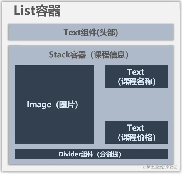 课程信息部分使用Stack堆叠容器,高度设置为height(120),设置子组件在容器内的对齐方式为Alignment.TopStart。Stack组件内嵌Image、Text、Divider组件,用于呈现课程图片、课程标题、课程价格及分割线等信息。具体如下:
