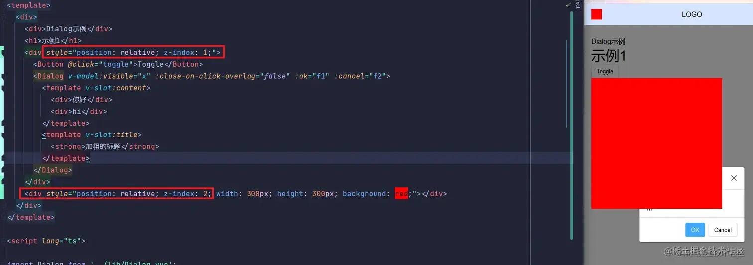 由于 CSS 层级上下文的原因,Dialog 组件虽然 z-index为10,但是其处于<div style="z-index: 1;">标签中,所以 Dialog 的层级肯定是没有外部 <div style="z-index: 2;"> 的层级高,从而被红色方框遮挡。这个组件的层级是由其所在的环境大小决定的,而不是由组件本身的层级来决定。 打个比方,一般学校里的尖子班,即便成绩排名中游,也会比普通班的中游成绩要高。