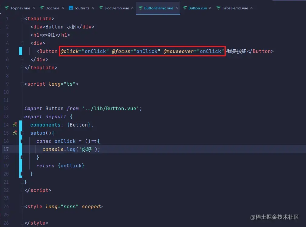 比如我一个组件想要 click 和 focus 两个事件,另一个组件只需要 click 事件,应该如何实现呢?主要思路是在组件内部声明setup,传入参数,并将获取到的参数 return 出来即可。