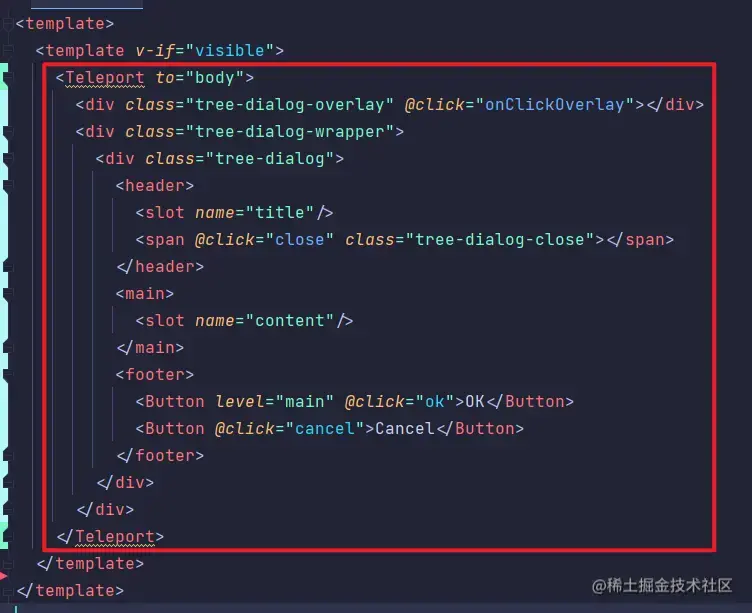 那我们应该如何防止 Dialog 被遮挡呢?这时候就需要使用 teleport 。teleport 的中文意思是“传送”,我们可以借用它来把 Dialog “传送”出去,这样就不会被其他元素影响了。