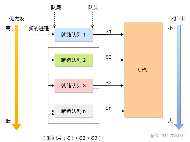 - 「多级」表示有多个队列,每个队列优先级从高到低,同时优先级越高时间片越短。