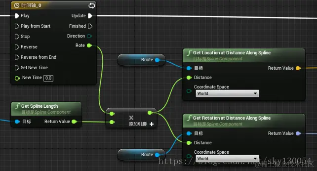 复制“Route”引用节点两次,分别牵引出“Get Location at Distance Along Spline”和“Get Rotation at Distance Along Spline”节点作如下连接