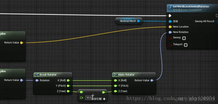 这里要注意一下,在“Get Rotation at Distance Along Spline”的后面需要一个分解角度重新设置的操作,因为实践中可以发现没有重新设置角度,会使物体移动过程中前后方向与运动方向垂直,当用“Break Rotation”和“Make Rotation”重新设置角度后可解决该问题!