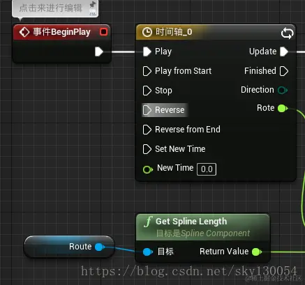 在“事件图表”添加事件节点“BeginPlay”或者碰撞触发事件什么的都行,再添加时间轴“Timeline”、将“组件”面板的“Route”拖拽到“事件图表”中并牵引出“Get Spline Length”节点如下图