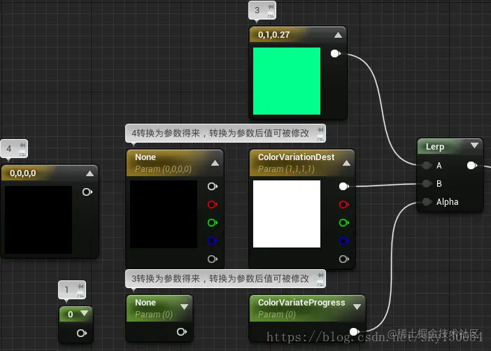 节点“Lerp”实现一个选择的作用,当alpha为0时输入A,为1时输入B,当“ColorVariateProgress”节点值由0到1变化时,“Lerp”节点输出结果便综合A、B的输入值。因此A输入的时花当前的颜色,而B输入的值是花的目标颜色。