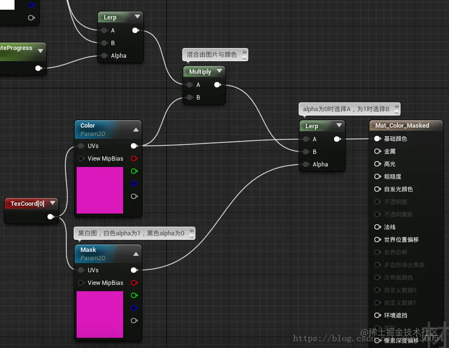 “Multiply”节点实现将第一个“Lerp”节点中得出颜色与添加的“Color”(贴图底色)混合,也就是将颜色赋予“Color”中的贴图编辑 ,而第二个“Lerp”就根据“Mask”