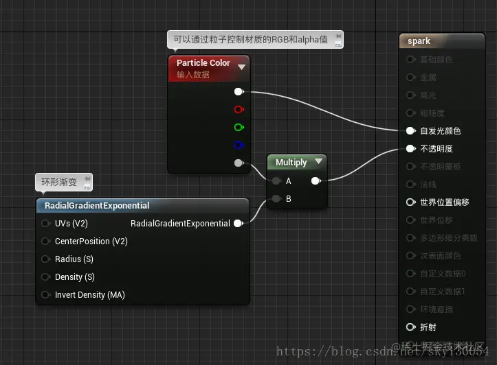 用“particle color”控制它的RGB值,再添加一个环形渐变的节点,作如下连接