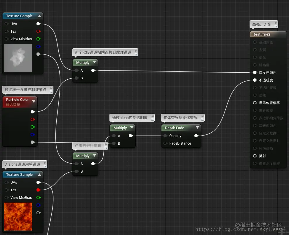 对应“Particle Color节点,可控制火焰颜色RGB与透明度alpha”