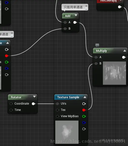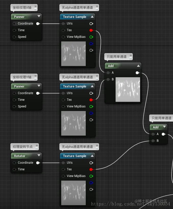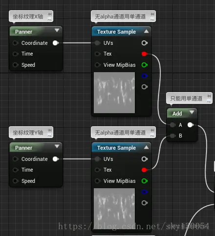 接下来要给它添加动态纹理,使“叠加纹理”分别作x轴和y轴的移动,再用“add”节点(该节点只能用单通道,此处用的红色通道)叠加,实现两层分明的移动效果