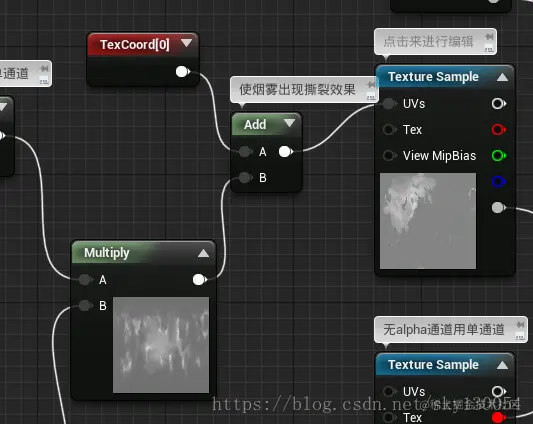最后将混合好的结果与“texturecoordinate”节点相叠加营造出烟雾撕裂的效果,再与烟雾底色贴图的“UVs”入口相连。