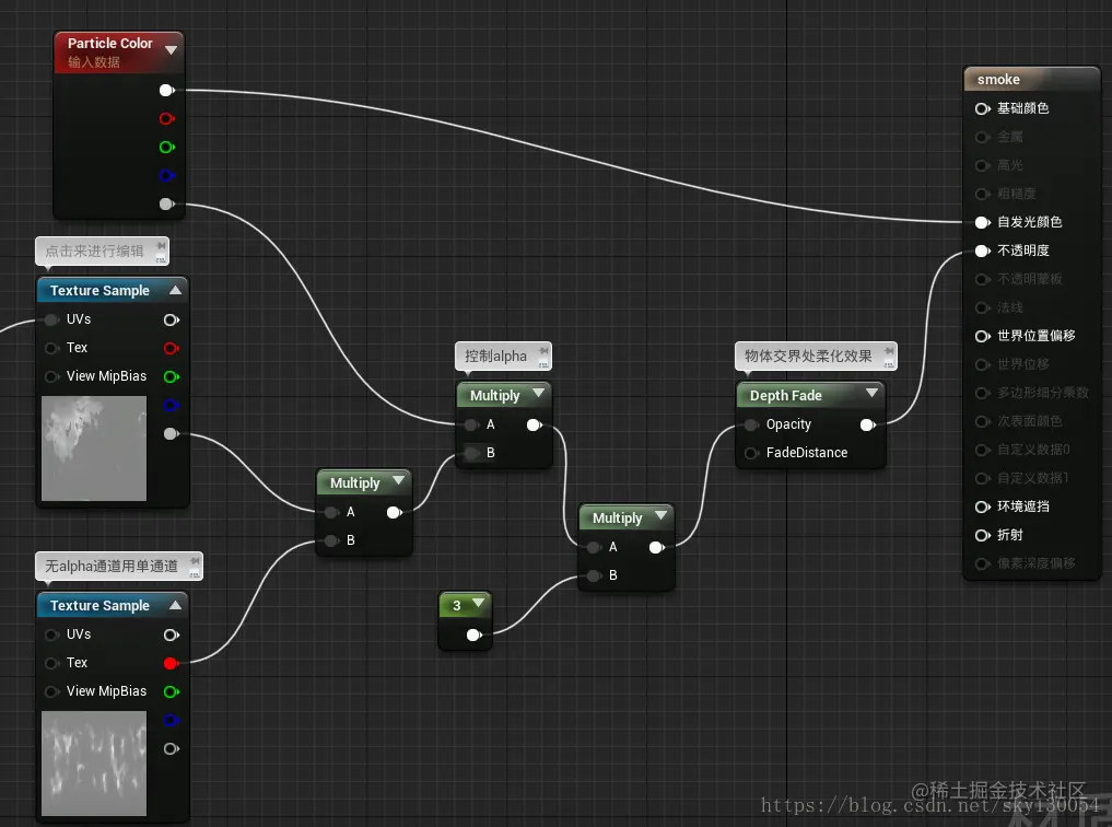 基础连接如上,烟雾为黑色,直接用粒子(Particle color)的alpha通道控制颜色,颜色通道使用粒子(Particle color)的RGB通道控制。
